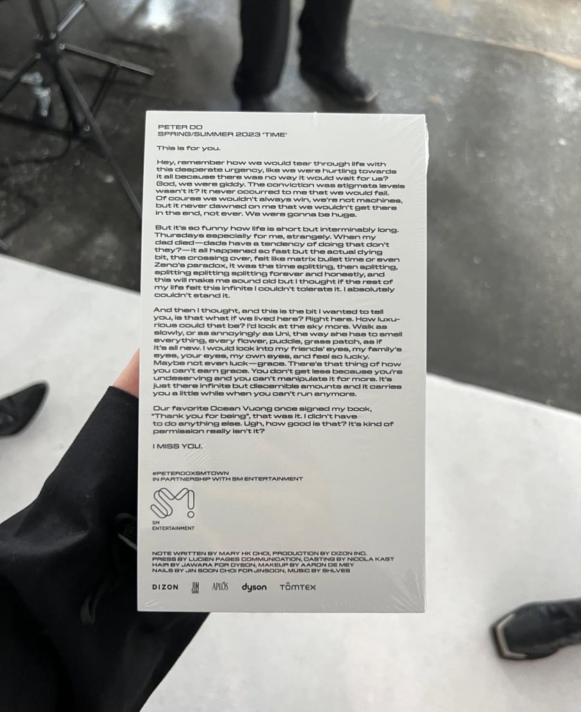 Mary H.K. Choi’s letter for Peter Do SS23, “Time,” via @the.peterdo on Instagram.
